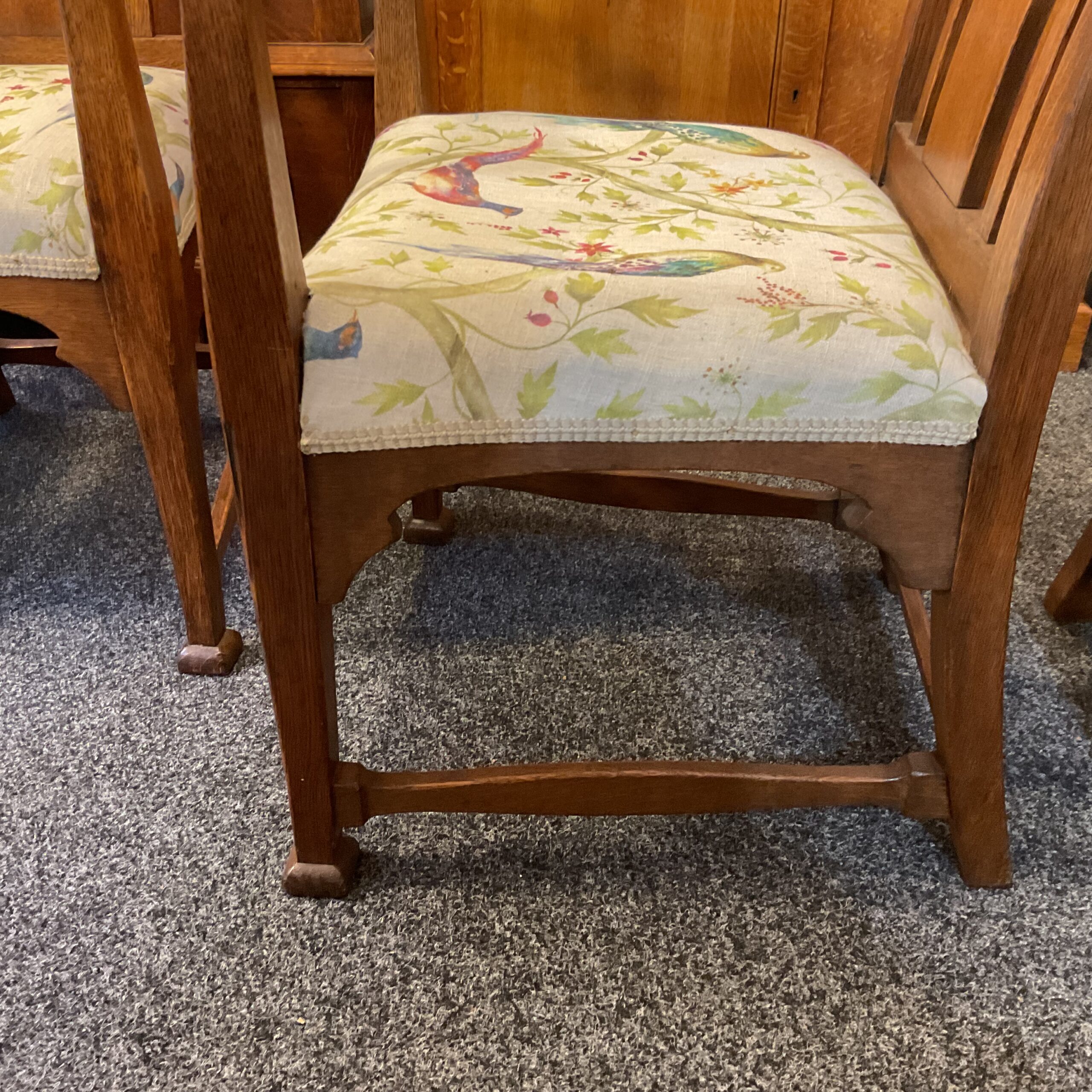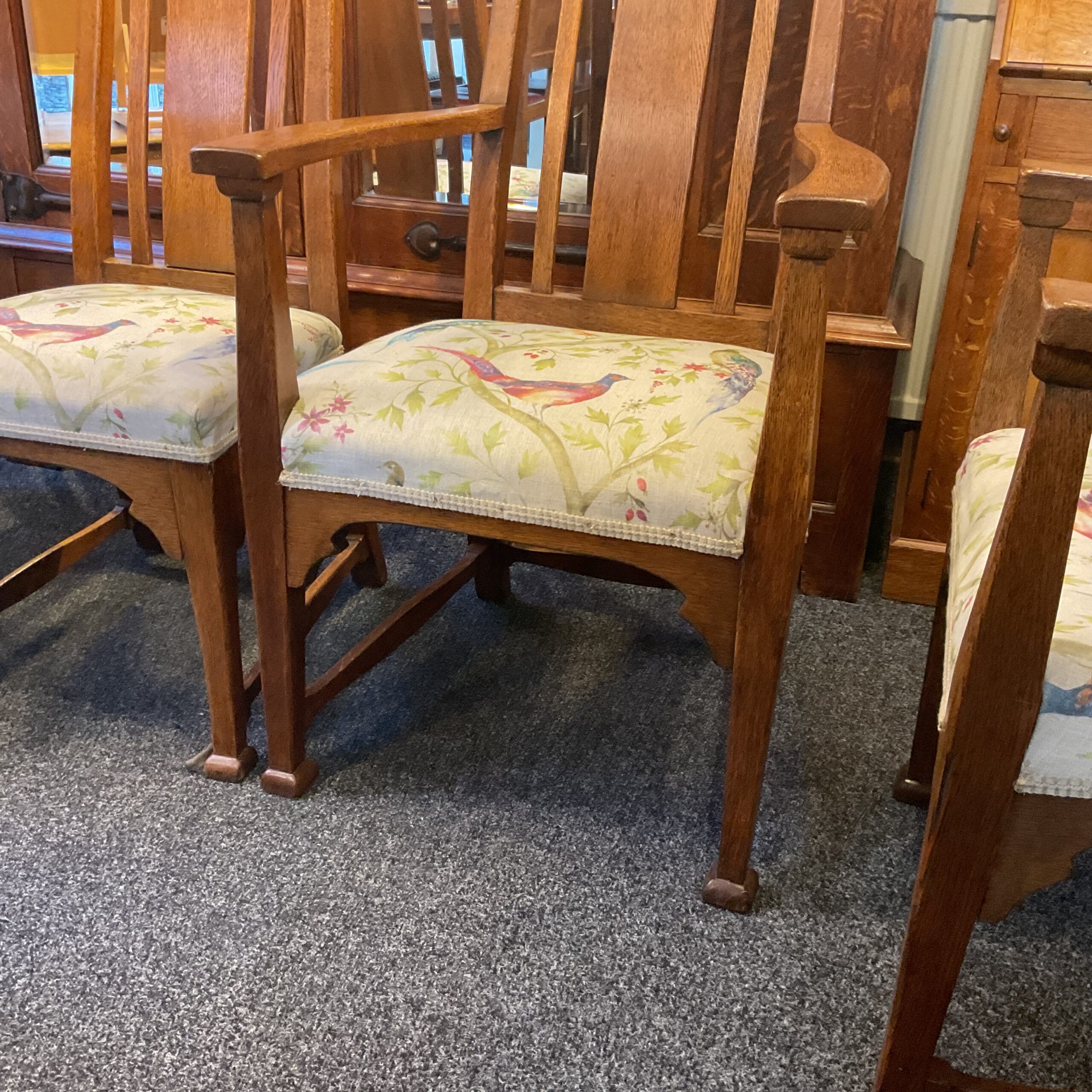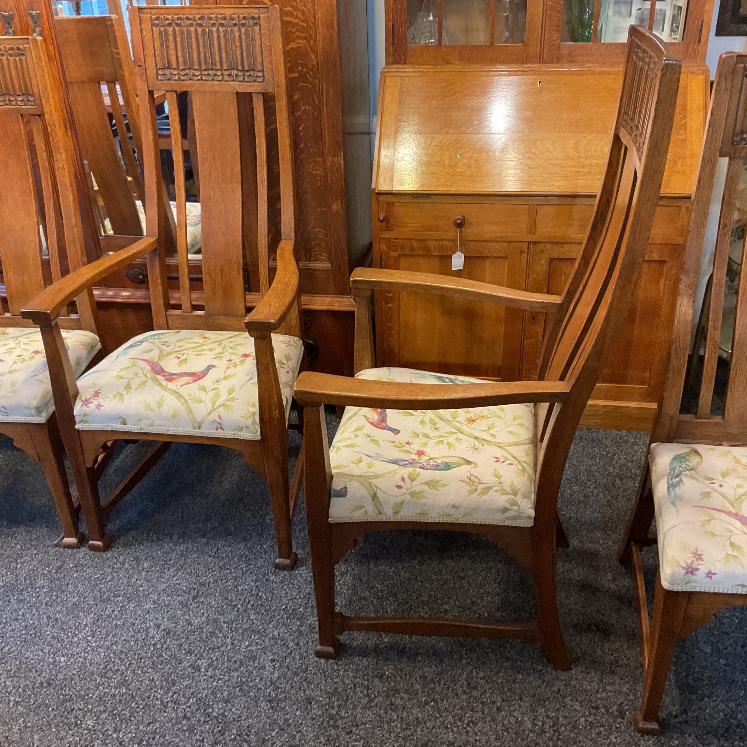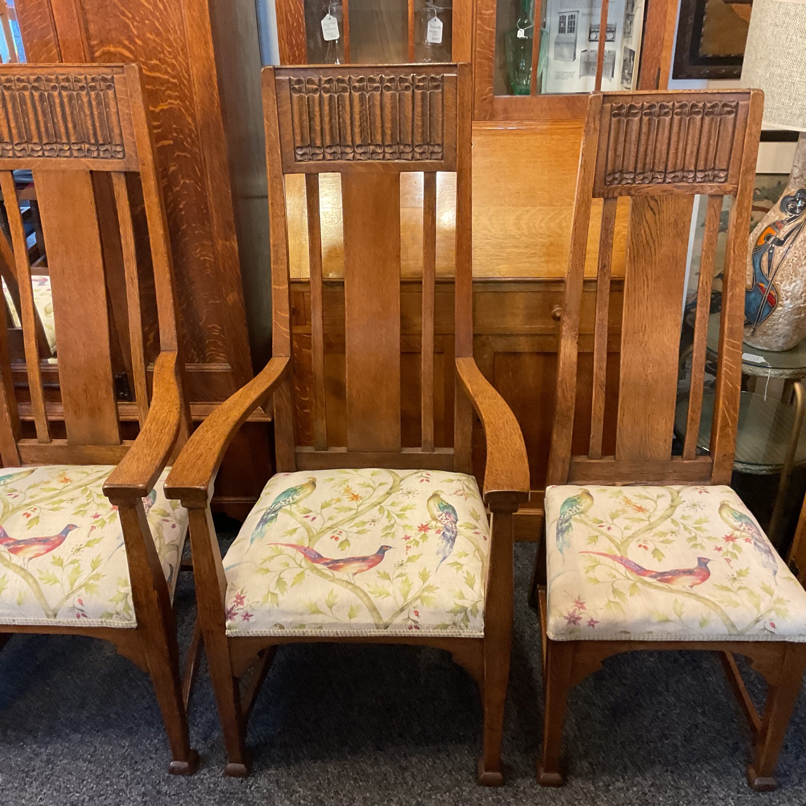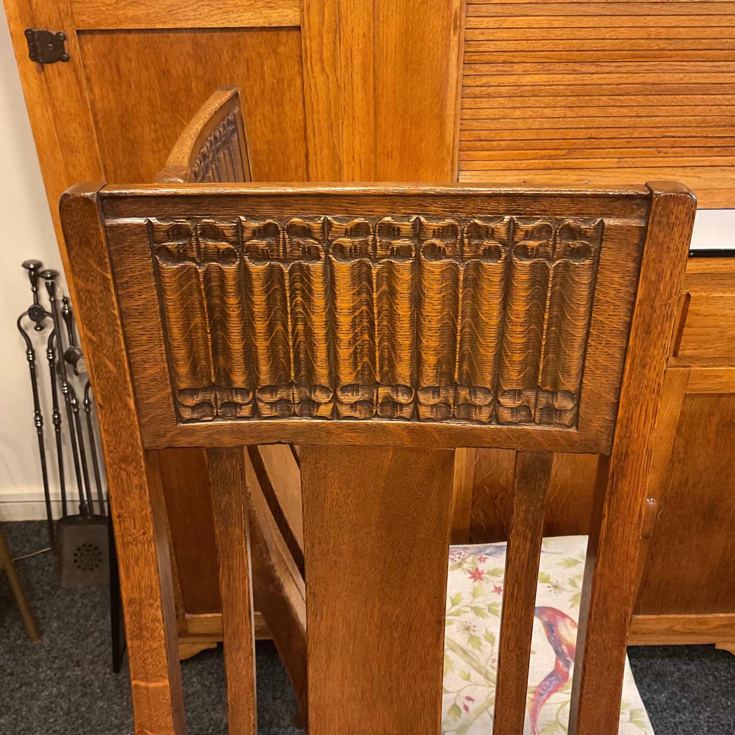 Unusual to find a set of 8 matching dining chairs. Made of solid English Oak all joints are solid and they are very comfortable. The carved linen press detail places them in the Arts and Craft period. A rare find with two carver chairs plus the six.